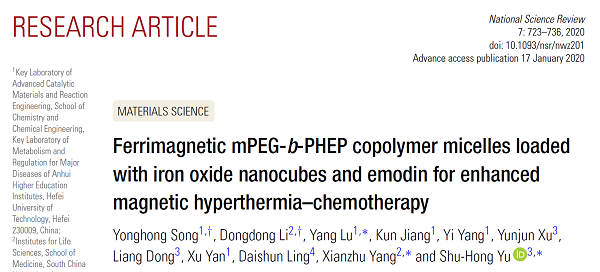 近日,3522vip浦京集团陆杨研究员课题组与中国科学技术大学俞书宏院士团队以及华南理工大学杨显珠教授课题组合作,以具有粘流态内核的mPEG-b-PHEP胶束作为纳米载体,包载磁性纳米立方体和具有肿瘤杀伤效果的中成药有效成分大黄素,实现恶性肿瘤的核磁共振造影成像(MRI)引导的磁热-化疗联合治疗。该研究提供了一种有效增强磁热治疗效果的方案,相关成果以“Ferrimagnetic mPEG-b-PHEP copolymer micelles loaded with iron oxide nanocubes and emodin for enhanced magnetic hyperthermia-chemotherapy”为题发表在《国家科学评论》(National Science Review 2020, 7, 723-736),论文的共同第一作者是3522vip浦京集团博士生宋永红和华南理工大学博士生李冬冬。