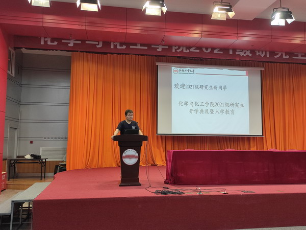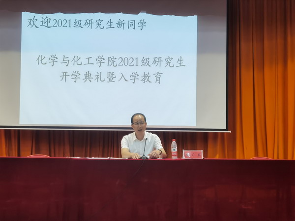 研究生导师代表何建波教授对2021级研究生新生的到来表示热烈的欢迎,他结合化学与化工学科发展历程和重要作用,希望研究生们能够尽快的适应研究生生活,鼓励同学们要坚持上进,立志高远,培养永不放弃的意志品质,自觉将自身的发展和国家的命运紧紧联系起来,全身心投入到研究生学习生活中来;要勇于突破传统思维的执固,多实践、多交流,充分利用学校的资源,锻炼和培养自己;要维持团结友善、和睦相处的人际关系,创造良好的学习生活环境;要注重科研诚信和学术道德的养成,决不能抄袭作假,培养良好的职业道德。