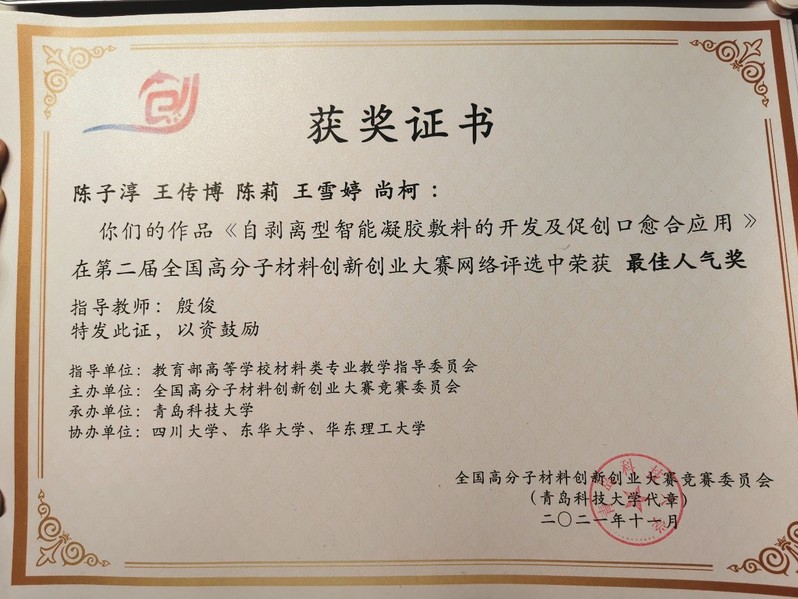 全国高分子材料创新创业大赛由教育部高等学校材料类专业教学指导委员会指导,全国高分子材料创新创业大赛竞赛委员会主办,第二届由青岛科技大学承办,四川大学、东华大学、华东理工大学协办,旨在深入贯彻落实新时代全国高校本科教育工作会议精神,推动创新创业教育融入高校人才培养全过程,促进大学生科技成果转化,实现以创新引领创业,以创业带动就业。本届大赛自8月启动以来,共有来自全国70余所高校的240支团队报名参赛,经过初赛环节,共遴选出34所高校的40件优秀作品进入总决赛,其中科技创新类作品30件,创业计划与创业实践类作品10件。决赛以参赛团队线上展示、评审专家线下评审相结合的方式举行。经网络投票、专家评审以及组委会评议,大赛共评选出最佳人气奖10项、金奖6项、银奖13项、铜奖21项。