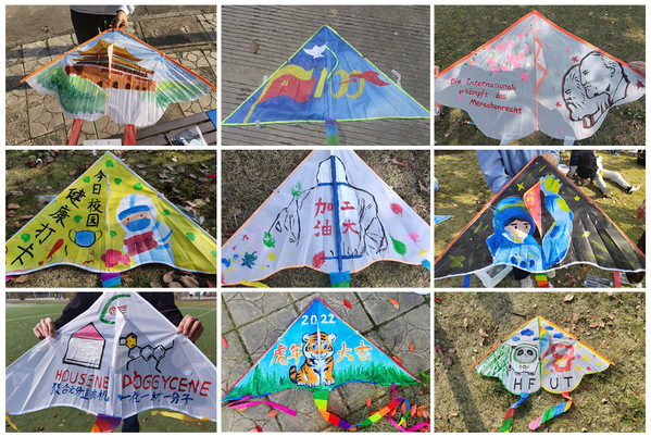 在活动现场,同学们有序领取制作风筝的材料包,工作人员认真核对发放材料,并耐心讲解相关注意事项和解答同学们的疑问,先后有来自13个学院的182支队伍,共计500余人参加了本次风筝节。在风筝制作阶段,同学们结合创作主题并以自由创作的形式在风筝上绘画,创作主题主要包括庆祝建团100周年、喜迎二十大、抗击疫情、爱校荣校、党史学习等,同学们通过自己的创意,呈现出契合活动主题的精美风筝作品。经过一个多小时的绘画制作,一个个承载同学们美好憧憬与向往的风筝逆风腾飞于蓝天,同学们的欢声笑语为春日的校园增添了无限活力。