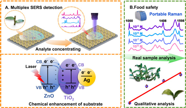 “民以食为天,食以安为先”,果蔬上的残留农药通过食物链的积累,会对人类健康和环境造成严重的危害。本课题组设计了一种三维核壳结构的ZnO@TiO2/AgNPs复合结构作为表面增强拉曼散射(SERS)基底,配合便携式拉曼光谱仪实现了对残留农药的快速定性定量检测。该工作使用ZIF-8的多孔框架结构来固定TiO2前驱体,然后通过热解转化为相应的金属氧化物半导体异质结,完成相变和空间框架结构的取代。随后,将等离子银纳米颗粒(AgNPs)固定在异质结表面来进一步提高基底的SERS活性。基于金属框架结构的SERS基底由于其优异的多孔结构和超大的比表面积,对目标分子具有更强的吸附能力,能有效提高灵敏度和重现性,并综合利用了电磁增强和化学增强机制,实现了高灵敏定量和多组分检测。此外,该基底对实物表面的农药残留也实现了高灵敏快速分析,检测极限低于欧盟标准。