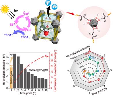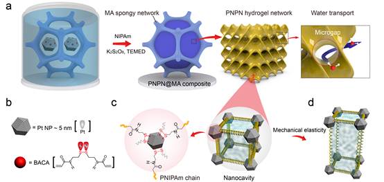 为实现上述目标,研究团队协同纳米复合交联、金属配位作用和原位聚合技术,合成了富含纳米腔结构、具有优异力学和高效自愈合性能的铂纳米颗粒/聚(N-异丙基丙烯酰胺)水凝胶体系。纳米腔的限域效应带来了高质子迁移速率和低水分子蒸发焓,具有微孔结构的非溶胀密胺海绵的引入,构建了第二重限域网络结构,抑制了凝胶在光催化过程中的溶胀,实现了其稳定的光催化产氢性能(3.27 mmol h-1g-1, TOF 4568 H2h-1)。通过在聚合物网络中原位生长导电高分子提高载流子迁移率,可进一步提高该催化体系的催化活性(5.60 mmol h-1g-1, TOF 7819 H2h-1)。