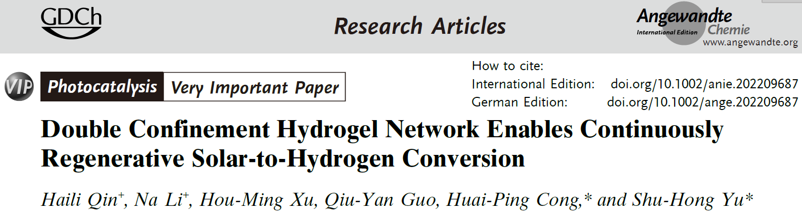 近日,我院从怀萍教授课题组与中国科学技术大学俞书宏院士研究团队合作,设计并研发了具有双重限域网络结构、可近红外光连续再生的高性能水凝胶光催化软材料。相关研究成果以“Double Confinement Hydrogel Network Enables Continuously Regenerative Solar-to-Hydrogen Conversion”为题发表在《德国应用化学》上(Angew. Chem. Int. Ed. 2022, e202209687),论文的共同第一作者是青年教师秦海利副教授和硕士研究生李娜,该工作被该刊选为VIP论文。