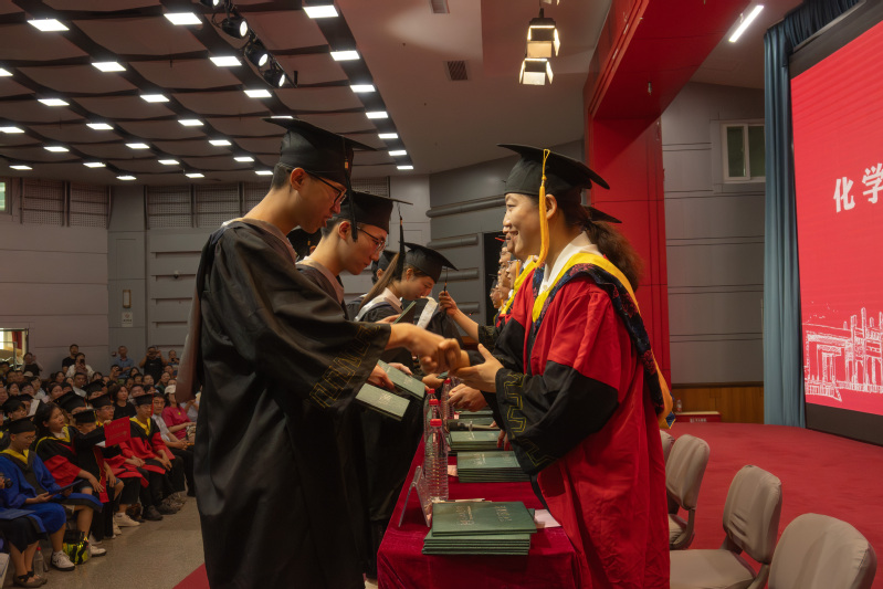 汪萌为学院与会的博士学位获得者、“安徽省优秀毕业生”荣誉称号获得者逐一颁发学位证书并扶正流苏。全体与会授学位者为其他学位获得者颁发学位证书、扶正流苏并合影留念。