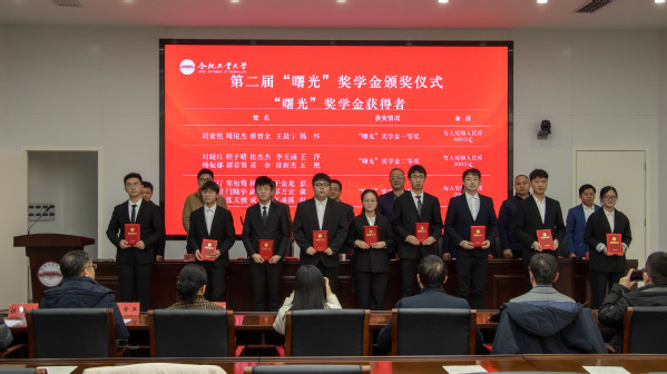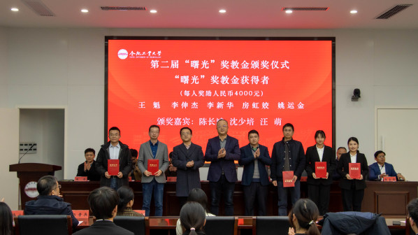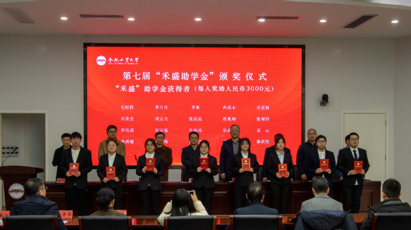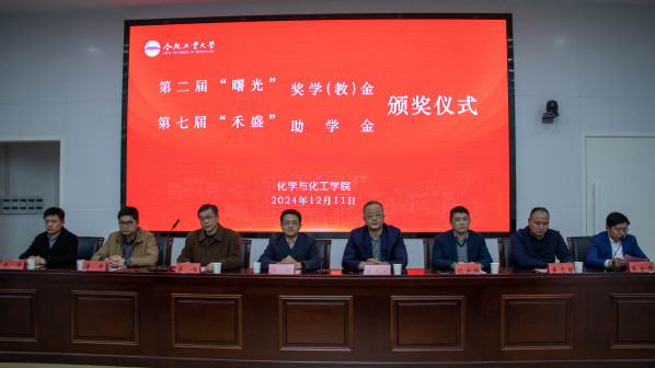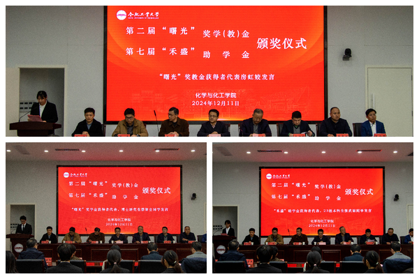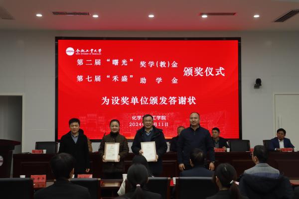 安徽曙光化工集团公司董事长陈长斌、合肥禾盛新型材料有限公司董事长梁旭先后致辞,对获奖师生表示祝贺,并分别简要回顾了“曙光”奖学(教)金、“禾盛”助学金设立的初衷,介绍了企业发展历程、现状,表示将持续关注支持学校发展,欢迎获奖同学毕业时到企业建功立业,共同促进企业与教育事业发展。