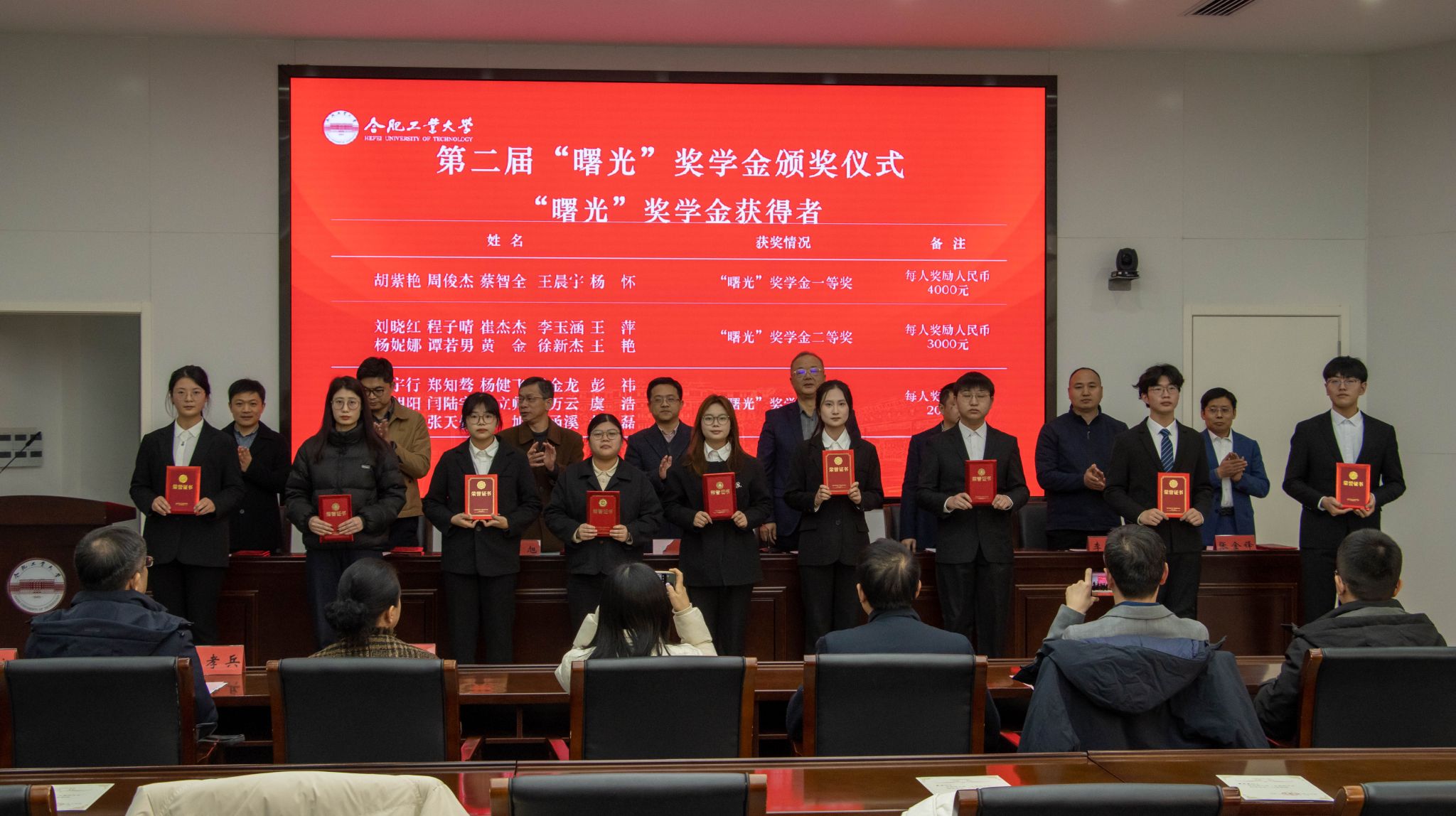 汪萌、陈长斌、沈少培为5位获得“曙光”奖教金的老师颁发获奖证书。主席台就坐领导为“曙光”奖学金、“禾盛”助学金获得者颁发获奖证书。