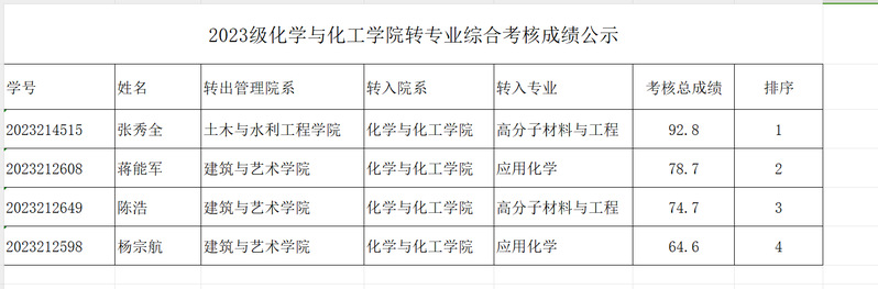根据《3522vip浦京集团普通全日制本科生转专业管理暂行办法》(合工大政发〔2024〕70号)以及《3522vip浦京集团合肥校区2023级本科生转专业接收方案》,学院转专业工作小组对4名申请转入同学进行了资格初审、笔试以及面试,现将综合考核成绩公示如下: