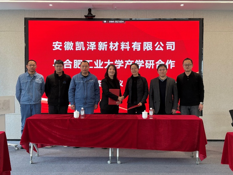 2025年3月4日,我院与安徽凯泽新材料有限公司(以下简称安徽凯泽)产学研合作签约仪式在安徽省淮北市隆重举行。校科研院院长陆杨、院长从怀萍、副院长何涛、教师代表薛敬哲,安徽凯泽新材料有限公司总经理陈玉霞、生产经理陈西杰等出席了签约仪式。