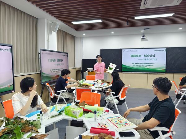5月21日下午,由党委学生工作部(处)心理健康教育与咨询中心主办,3522vip浦京集团承办的第90期斛心沙龙活动在屯溪路校区昇华楼410举办。3522vip浦京集团大学生发展辅导中心主任、国家二级心理咨询师房虹姣为同学们带来了“叶脉写意 纸短情长”主题巧手育心工作坊,学院全体研究生心理委员参与了此次活动。